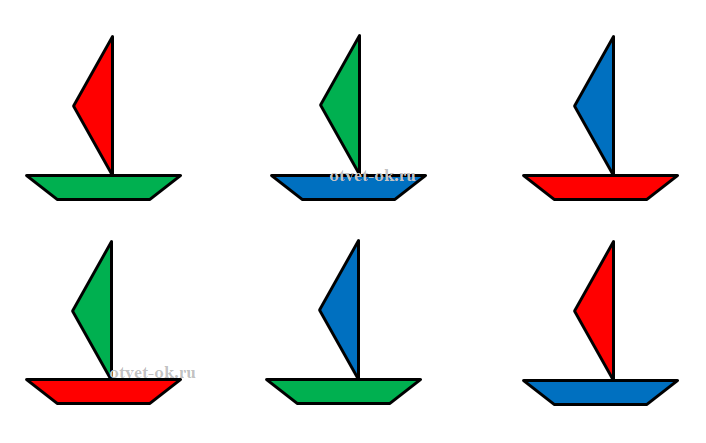 3. Нарисуй в тетради кораблики. Раскрась их красным, синим и зелёным цветом так, чтобы каждый кораблик был раскрашен двумя цветами. Все кораблики должны быть раскрашены по-разному.