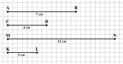 АВ = 7 см, CD = 4 см, MN = АВ + CD, KL = АВ - CD.