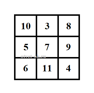 9. Начерти в тетради такой квадрат. Вставь в пустые клетки числа 3, 4, 5, 6, 8, 9 так, чтобы квадрат стал «магическим». Обсуди своё решение с одноклассниками.