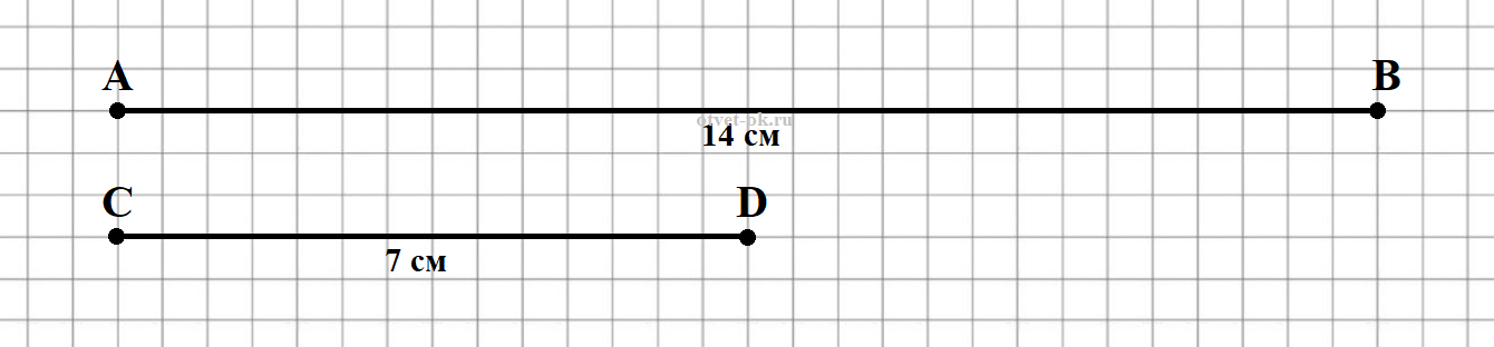 2. Начерти два отрезка: один длиной 14 см, а другой в 2 раза короче. Найди сумму и разность длин этих отрезков.