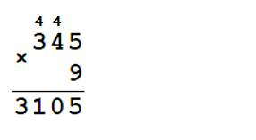 Умножим число 345 на 9 в столбик. Умножаем 5 единиц на 9, получается 45 единиц. Подписываем 5 единиц под единицами, а 4 десятка надписываем над десятками верхнего множителя.