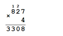 И наконец, умножим 8 сотен на 4, получится 32 сотни, да ещё 1 сотня, всего 33 сотни. Это число сотен записываем в произведении слева от 0 десятков. Читаем ответ: значение произведения чисел 827 на 4 равно 3 308.