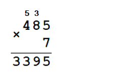Умножим число 485 на 7 в столбик. Умножаем 5 единиц на 7, получается 35 единиц. Подписываем 5 единиц под единицами, а 3 десятка надписываем над десятками верхнего множителя.