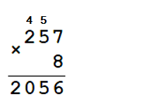 И наконец, умножим 2 сотни на 8, получится 16 сотен, да ещё 4 сотни, всего 20 сотен. Это число сотен записываем в произведении слева от 5 десятков. Читаем ответ: значение произведения чисел 257 и 8 равно 2 056.