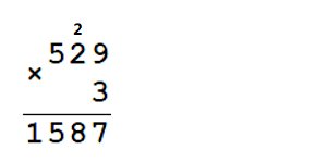 Умножим число 529 на 3 в столбик. Умножаем 9 единиц на 3, получается 27 единиц. Подписываем 7 единиц под единицами, а 2 десятка надписываем над десятками верхнего множителя.