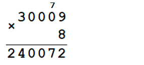 Найдём значение произведения чисел 30 009 и 8. Умножим 9 единиц на 8, получится 72 единицы.