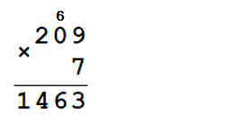 Умножим число 209 на 7. Начнём с единиц: 9 единиц умножить на 7, получится 63 единицы. Подписываем 3 единицы под единицами, а 6 десятков надписываем над десятками верхнего множителя. Теперь умножаем 0 десятков на 7, получается 0 десятков. Прибавляем 6 десятков, полученных от умножения 9 единиц на 7, получается 6 десятков, которые подписываем под десятками. Умножаем 2 сотни на 7, получается 14 сотен. Это число сотен записываем в произведении слева от 6 десятков. Значение произведения чисел 209 и 7 равно 1 463.