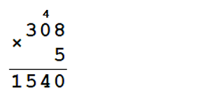 Умножим число 308 на 5. Начнём с единиц: 8 единиц умножить на 5, получится 40 единиц. Подписываем 0 единицы под единицами, а 4 десятка надписываем над десятками верхнего множителя. Теперь умножаем 0 десятков на 5, получается 0 десятков. Прибавляем 4 десятка, полученные от умножения 8 единиц на 5, получается 4 десятка, которые подписываем под десятками. Умножаем 3 сотни на 5, получается 15 сотен. Это число сотен записываем в произведении слева от 4 десятков. Значение произведения чисел 308 и 5 равно 1 540.
