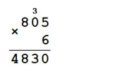 Умножим число 805 на 6. Начнём с единиц: 5 единиц умножить на 6, получится 30 единиц. Подписываем 0 единиц под единицами, а 3 десятка надписываем над десятками верхнего множителя. Теперь умножаем 0 десятков на 6, получается 0 десятков. Прибавляем 3 десятка, полученные от умножения 5 единиц на 6, получается 3 десятка, которые подписываем под десятками. Умножаем 8 сотен на 6, получается 48 сотен. Это число сотен записываем в произведении слева от 3 десятков. Значение произведения чисел 805 на 6 равно 4 830.