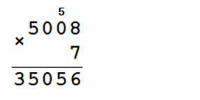Найдём значение произведения чисел 5 008 и 7. Умножим 8 единиц на 7, получится 56 единиц.