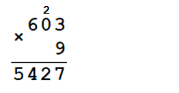 Умножим число 603 на 9. Начнём с единиц: 3 единицы умножить на 9, получится 27 единиц. Подписываем 7 единиц под единицами, а 2 десятка надписываем над десятками верхнего множителя. Теперь умножаем 0 десятков на 9, получается 0 десятков. Прибавляем 2 десятка, полученные от умножения 3 единиц на 9, получается 2 десятка, которые подписываем под десятками. Умножаем 6 сотен на 9, получается 54 сотни. Это число сотен записываем в произведении слева от 2 десятков. Значение произведения чисел 603 на 9 равно 5 427.