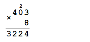 Умножим число 403 на 8. Начнём с единиц: 3 единицы умножить на 8, получится 24 единицы. Подписываем 4 единицы под единицами, а 2 десятка надписываем над десятками верхнего множителя. Теперь умножаем 0 десятков на 8, получается 0 десятков. Прибавляем 2 десятка, полученные от умножения 3 единиц на 8, получается 2 десятка, которые подписываем под десятками. Умножаем 4 сотен на 8, получается 32 сотни. Это число сотен записываем в произведении слева от 2 десятков. Значение произведения чисел 403 и 8 равно 3 224.