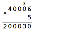 Значение произведения чисел 40 006 и 5 равно 200 030.