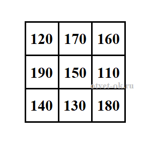 8. Начерти в тетради такой квадрат. Вставь в пустые клетки числа 120, 140, 150, 160, 170, 190 так, чтобы квадрат стал «магическим».