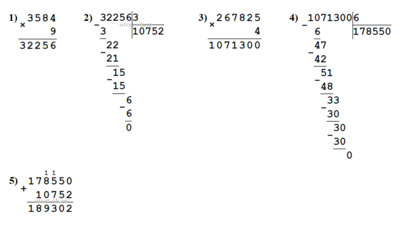3 584 • 9 : 3 + 267 825 • 4 : 6 = 189 302