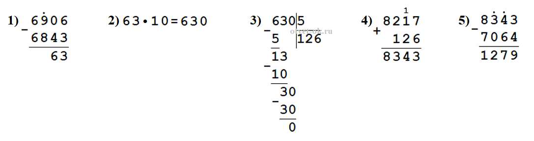 8 217 + 10 • (6 906 - 6 843) : 5 - 7 064 = 1 279