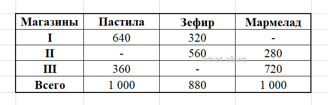 8. Кондитерская фабрика поставляет свою продукцию в три магазина. Первый магазин заказал 960 коробок с зефиром и пастилой, причём треть всего заказа составляют коробки с зефиром. Второй магазин заказал 840 коробок с зефиром и мармеладом, причём треть всего заказа составляют коробки с мармеладом. Третий магазин заказал 1 080 коробок с пастилой и мармеладом, причём треть всего заказа составляют коробки с пастилой. Сколько коробок с зефиром должна изготовить фабрика, чтобы выполнить все заказы? Сколько коробок с мармеладом? А сколько с пастилой? Реши задачу, заполнив в тетради таблицу.