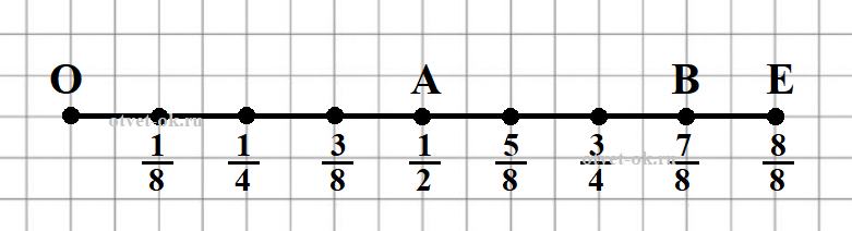 4. Длина отрезка ОА равна 1/2 длины отрезка ОЕ, точка А изображает дробь 1/2. Длина отрезка ОВ равна 7/8 длины отрезка ОЕ, точка В изображает дробь 7/8.