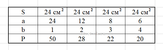 Т.е. стороны прямоугольника могут быть со сторонами 24 см и 1 см, 12 см и 2 см, 8 см и 3 см, 6 см и 4 см.
