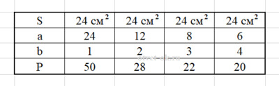 8. Площадь S прямоугольника равна 24 см2. Какой длины могут быть стороны этого прямоугольника? Обоснуй свой ответ. Заполни в тетради таблицу, где а и b — значения сторон, а Р — периметр прямоугольника.