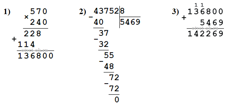 а) 570 • 240 + 43 752 : 8 = 142 269