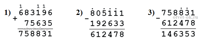 б) сумму чисел 683 196 и 75 635 уменьшить на разность чисел 805 111 и 192 633;