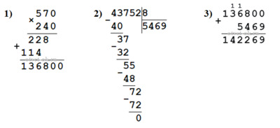 а) к произведению чисел 570 и 240 прибавить частное чисел 43 752 и 8;