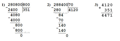 г) частное чисел 280 800 и 800 увеличить на частное чисел 288 400 и 70.
