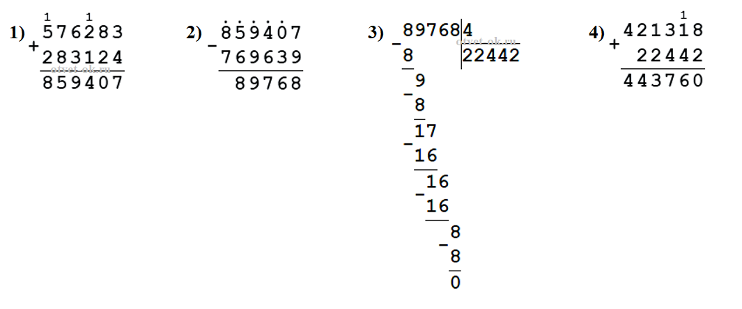 (283 124 + 576 283 - 769 639) : 4 + 421 318 = 443 760