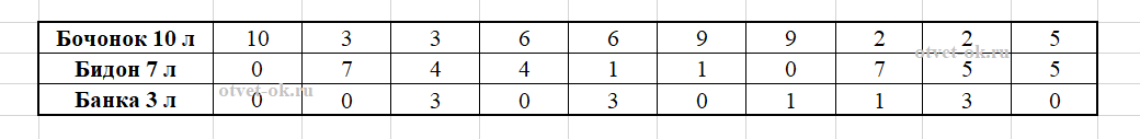 12. В бочонке 10 л мёда. Как с помощью бидона, вмещающего 7 л, и трёхлитровой банки разлить этот мёд пополам? Ответь на вопрос задания, заполнив в тетради таблицу.